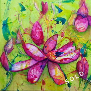 Using vibrant acrylic washes and glazes, often botanically inspired, the composition evolving as the layers build up, influenced by those initial abstract beginnings. I am always thrilled to share a little happiness with those who enjoy my work!